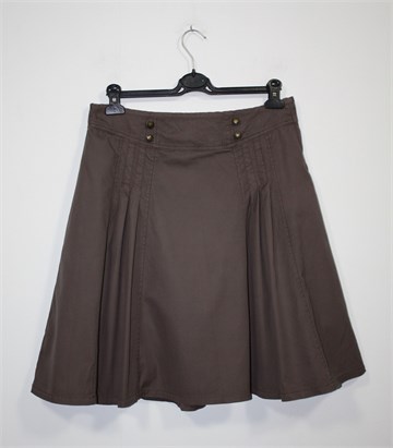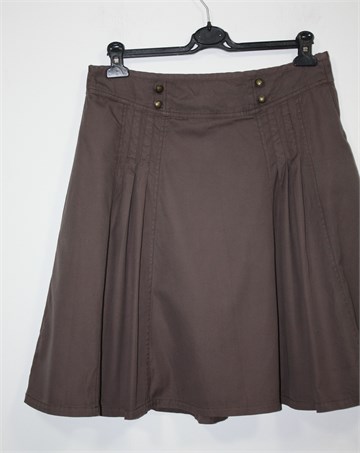 H&M suknja smeđe boje, faldice sa prednje i stražnje strane (kao na slici, jednako sa obje strane). Bočni cif i kopčanje, podstavljena. Tanji pamuk ali zbog podstave nosiva cijelu godinu.