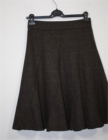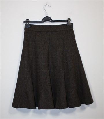 H&M suknja od debljeg štofa, prošarano smeđe boje s uzorkom (vidljivo na slici). Stražnji cif i gumbić, podstavljena. Midi dužine.