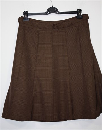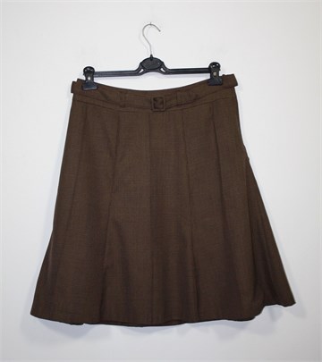 H&M suknja smeđe boje sa tamno smeđim uzorkom (vidljivo na slikama). Bočni cif i gumbić, pasica za remen sa pripadajućim remenom od istog materijala (može se skinuti). Materijal je štof, suknja je podstavljena.