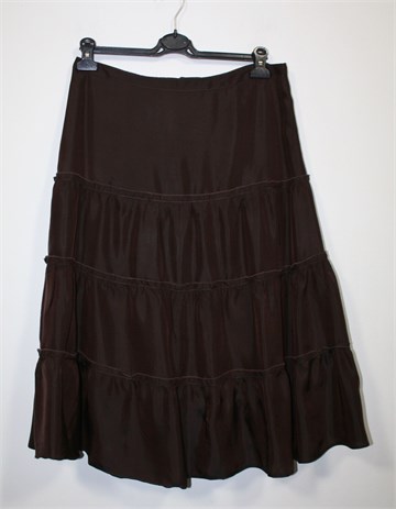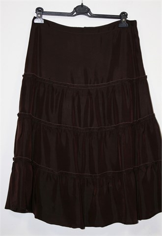 H&M duža suknja tamno smeđe boje sa volanima. Materijal je blago sjajan i boja se presijava. Bočni cif i gumbić, podstavljena. Tanja i lagana.
