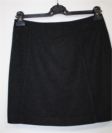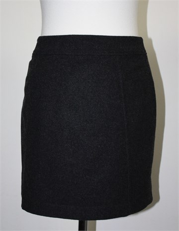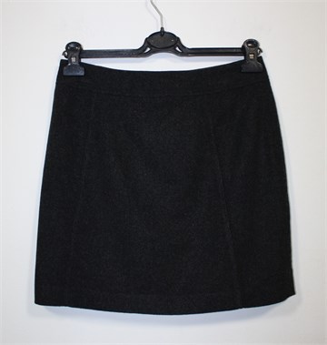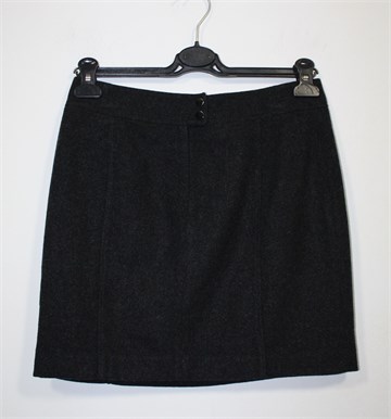 H&M kraća suknja od debljeg vunastog materijala, prošarano tamno sive boje. Sa stražnje strane cif i kopčanje na drukere, podstavljena.