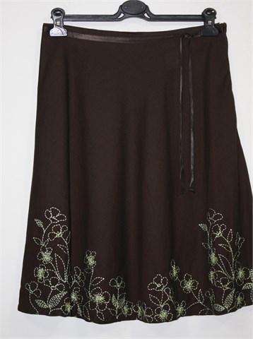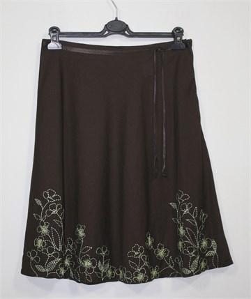 H&M pamučna suknja tamno smeđe boje, ukrašena aplikacijama i perlicama u zelenoj boji (cvjetne aplikacije - vidjeti slike). Na pasicu je našivena ukrasna trakica (sa prednje strane se veže u mašnicu), bočni cif i gumbić. Tanak i lagan pamuk, moguće blago providan (blago rastezljiv).