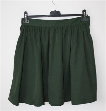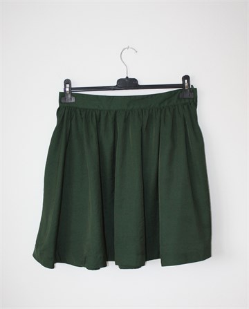 H&M suknja tamno zelene boje, materijal je blago sjajan. Prednji bočni džepovi, bočni cif i gumbić. Tanja i lagana, nije rastezljiva.