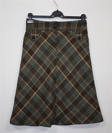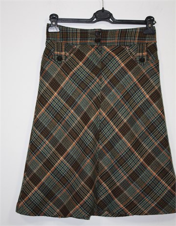 H&M suknja u kombinaciji smeđih i zelenih nijansi sa kariranim uzorkom, mjestimično protkana sjajnim nitima. Prednji cif i kopčanje, prednji džepovi. Topli štofasti materijal, podstavljena. Nešto duža sa stražnje strane.