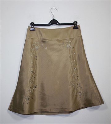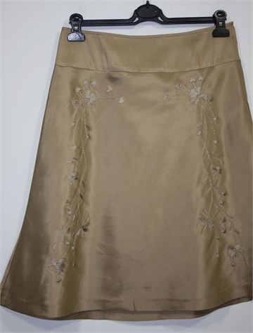 H&M svilena suknja tamno bež boje, sa prednje strane ukrašena aplikacijama od konca. Bočni cif i gumbić, podstavljena. Mjestimične crtice u tkanju (takva je kupljena). Blago sjajna.