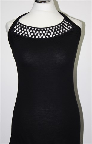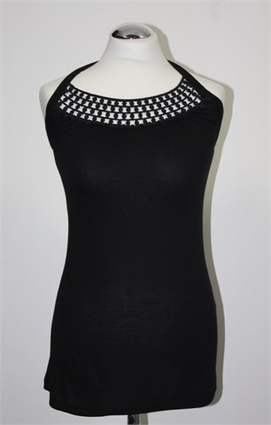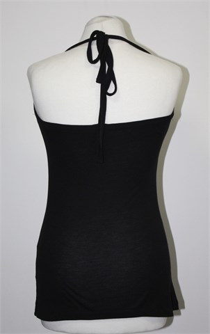 H&M topić crne boje sa heklanim detaljima sa prednje strane. Vezanje oko vrata, sa stražnje strane gumica pa je širina u prsima prilagodljiva. Tanji i rastezljiv materijal.