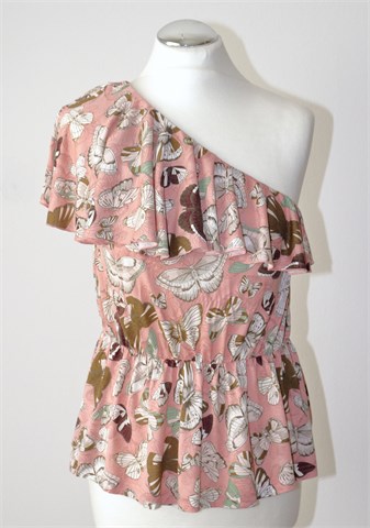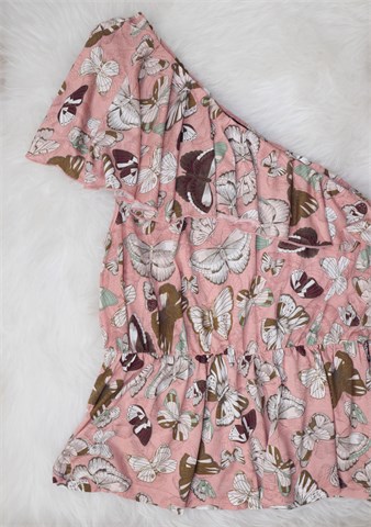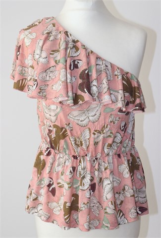 H&M topić pastelno tamnije roze boje sa printom leptira (boje i uzorak printa vidljivi na slikama). Nosi se na jedno rame (drugo je otvoreno), u gornjem dijelu ušivena je skrivena gumica koja drži majicu na mjestu. U gornjem dijelu volančić, gumica u struku. Prekrasan, lagan i lepršav. Rastezljiv materijal.