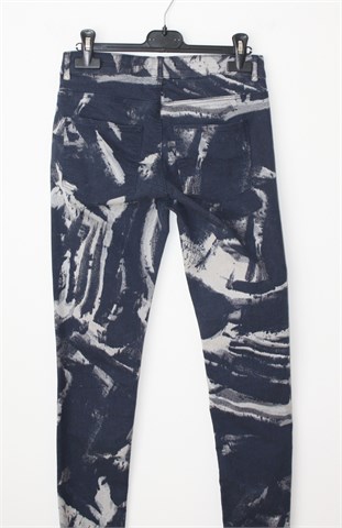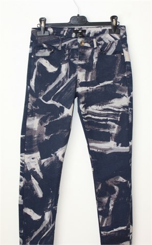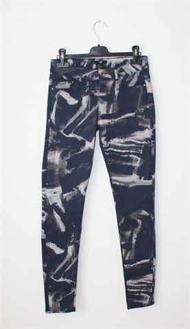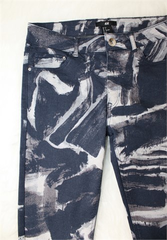 H&M tanje traper hlače plave boje sa printom (boje i uzorak printa vidljivi na slikama). Prednji cif i kopčanje, pasica za remen. Prednji i stražnji džepovi, rastezljive.
