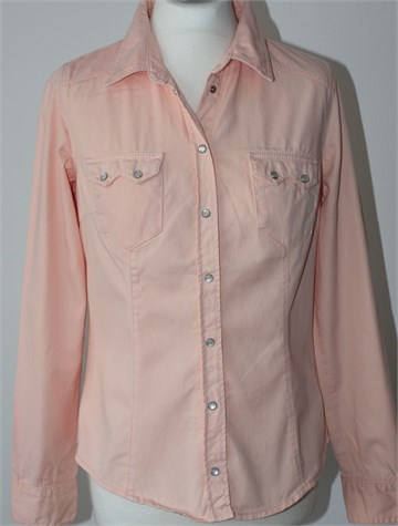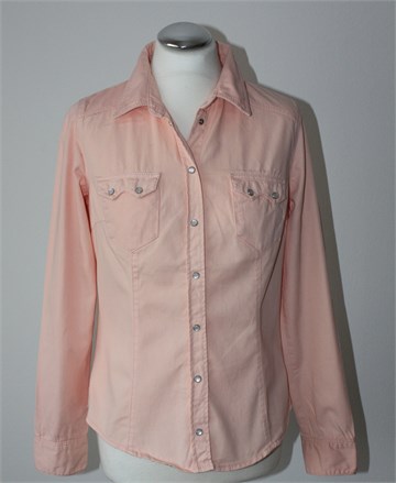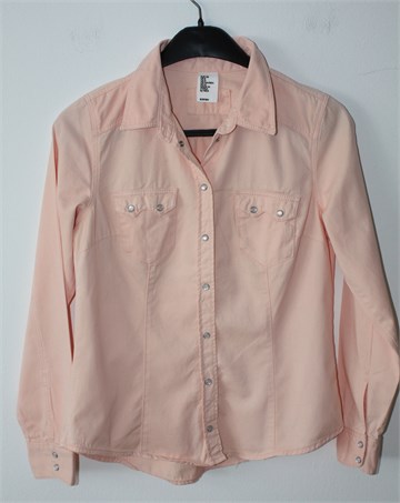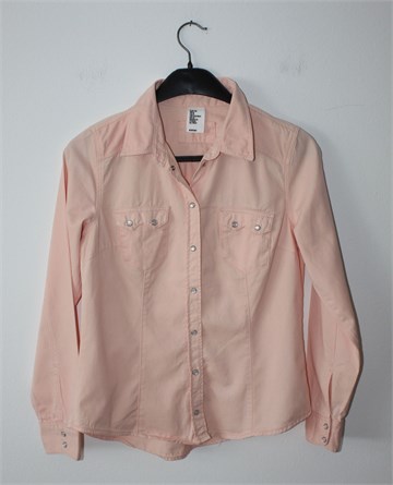 H&M traper košulja od tanjeg i laganog trapera, rozo-narančaste boje (boja breskve). Prednje kopčanje sa drukerima, džepići na prsima. Strukirana, nerastezljiva.