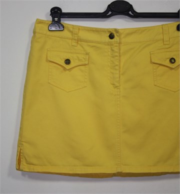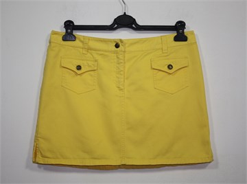 H&M suknja od tanjeg trapera lijepe žute boje. Prednji cifi  kopčanje, pasica za remen. Sa prednje strane mali džepovi sa preklopom i gumbom, mali bočni prorezi.