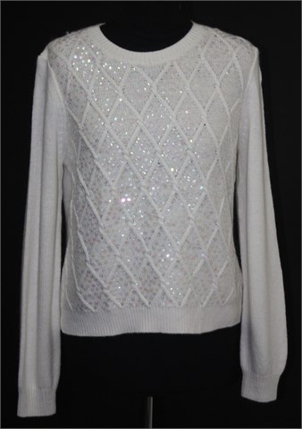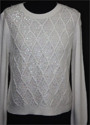 H&M pulover/vesta bijele boje, sa prednje strane ukrašena prozirnim šljokicama. Mekano, mucasto i rastezljivo pletivo.