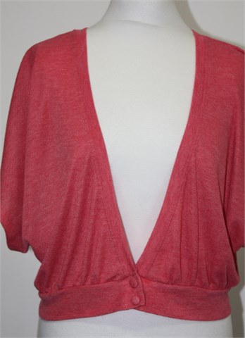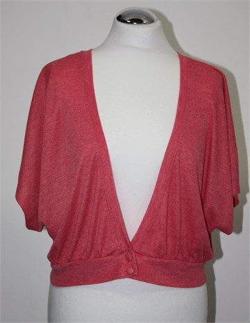 H&M kraći tanji kardigan/vesta/bolero bez rukava, prednje kopčanje sa dva gumbića. Širi otvori oko rukava, blago stegnuta pasicom u struku. Materijal je tanak, mekan i rastezljiv sa mjestimičnim rupičastim dijelovima. Boja je prošarano koraljno roza (intenzivna nijansa).