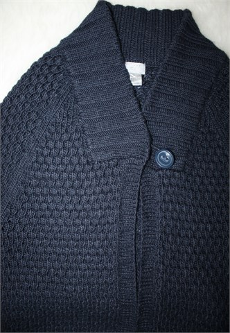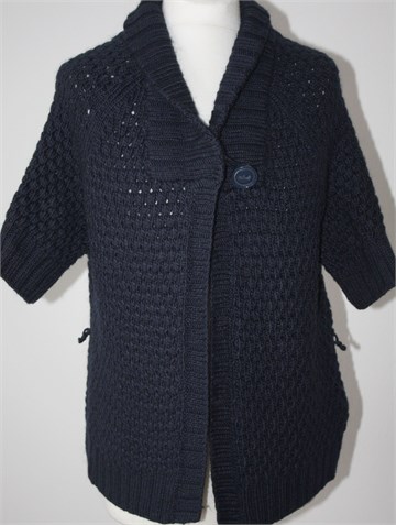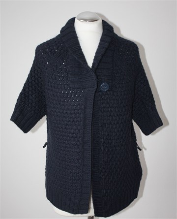 H&M vesta/kardigan sa kratkim rukavima, plave boje. Prednje kopčanje sa jednim gumbom. Deblje i rastezljivo pletivo, bočne ušice za remen.