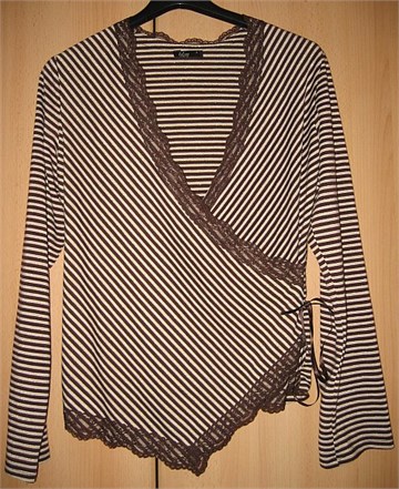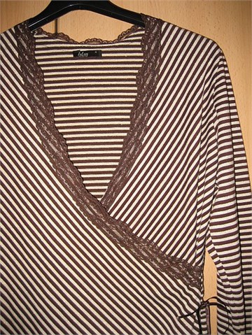 Preslatka majčica, djeluje kao da je na preklop ali nije, zašivena je sa bočne strane. Satenska bočna mašnica, čipkica na rubovima. Bež dijelovi su protkani zlatnim nitima pa svjetluca. Prilično rastezljiva, vrlo mekana. Mislim da najbolje pristaje veličini 42 (vidjeti mjere).