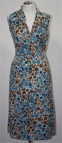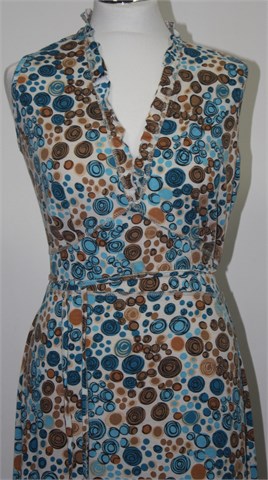 Haljina bez rukava, bijele boje sa printom u većinom plavoj i smeđoj boji. Oko dekoltea volančić sa svake strane. Preštepana u struku, bočne vezice sa svake strane za vezanje sa prednje ili stražnje strane. Vrlo mekan i ugodan materijal, rastezljiv.