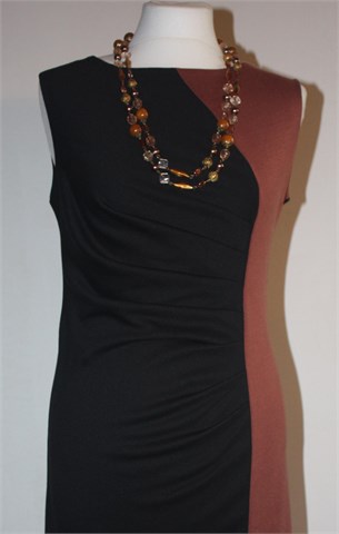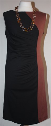Haljina bez rukava, crne boje sa detaljima u boji cigle/smeđoj boji.