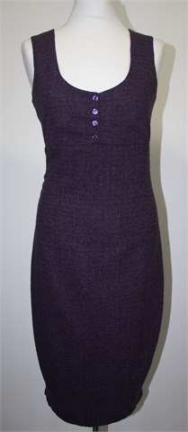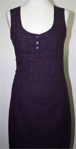 Unikatna i šivana haljina od štofastog materijala, prošarano ljubičasto-crne boje sa decentim špricanim uzorkom. Bez rukava, prednje kopčanje sa gumbićima. Rezana ispod prsiju, sa stražnje strane mali rasporak. Stražnji cif, podstavljena.