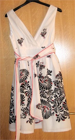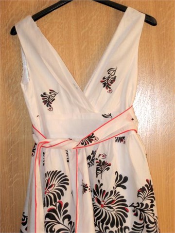 Prekrasna haljina bijele boje sa cvjetnim printom u crvenoj i crnoj boji. Bočni cif, podstavljena. Pripadajući remen napravljen od istog materijala kao što je i haljina, veže se preko pasice. Vrlo lagana, prozračna i lepršava :)