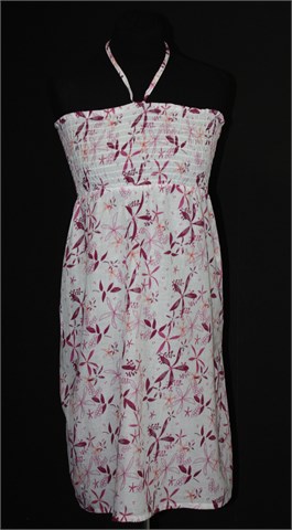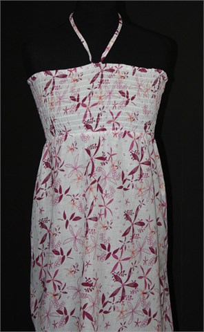 Haljina/tunika bijele boje sa šarenim cvjetnim printom (boje i uzorak printa vidljivi na slikama). U gornjem dijelu prošivena gumicama pa je širina prilagodljiva (vidjeti mjere), sa prednje strane vezice koje se vežu oko vrata. Vrlo tanak i lagan pamuk, moguće providan.