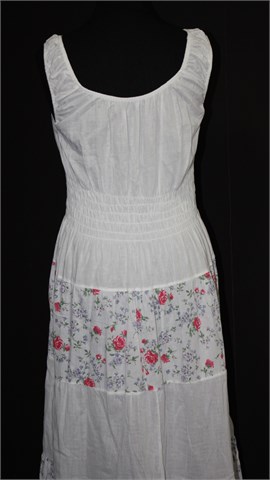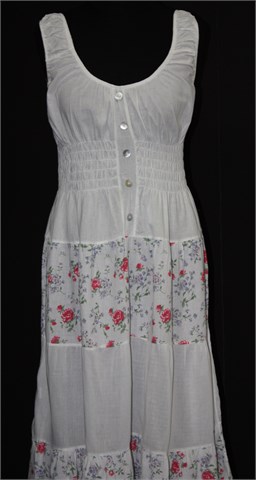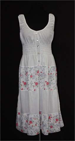 Haljina bez rukava, bijele boje sa cvjetnim detaljima (vidljivo na slici). Sa prednje strane ukrasno kopčanje sa sedefastim gumbima, ušivena gumica oko otvora dekoltea i naramenica. Prošivena gumicama u struku. Lagan i tanji pamuk.