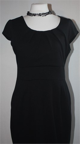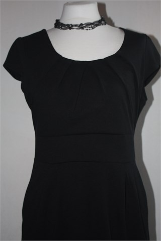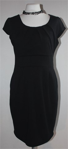 Haljina crne boje sa kratkim rukavima. Bočni džepovi. Deblji i rastezljiv pamučni materijal.