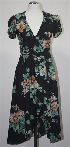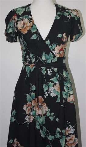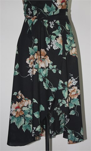 Haljina crne boje sa šarenim cvjetnim printom, preklop sa prednje strane. Kratki, blagi puf rukavići, vezanje u struku sa dvije bočne trake. Kada je zavezana dosta je dekoltirana i prednji dio je kraći u odnosu na stražnji, krojena je tako da se donji dio rastvara kada se hoda (dakle bilo bi dobro nositi nešto ispod jer je prilično otvorena i blago prozirna). Lagan i prozračan materijal.