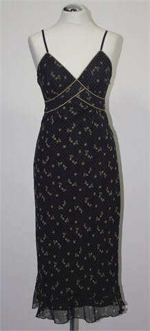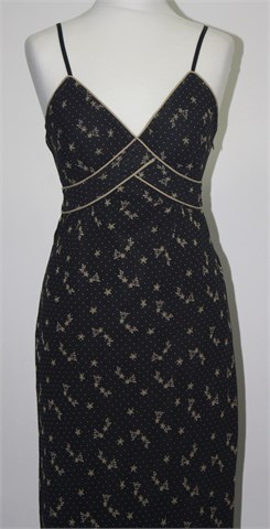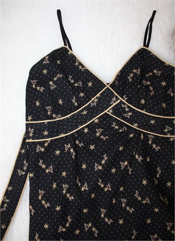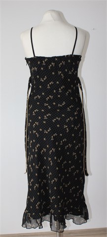 Haljina crne boje sa cvjetno-točkastim printom u smeđe-bež nijansama. Tanke, rastezljive naramenice, bočne šire trake za vezanje. Na leđima, uz gornji šav, je ušivena gumica pa je širina prilagodljiva (vidjeti mjere), na dnu mali volančić. Haljina je podstavljena i ima bočni cif. Blago rastezljiva.