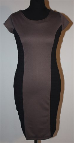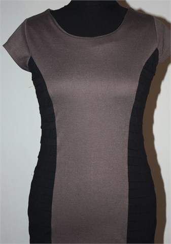 Haljina sa kratkim rukavima, kombinacija smeđe i crne boje. Rastezljiva, stražnji cif. Prekrasno stoji i zbog bočnih crnih dijelova odlično vizualno stanjuje figuru :)