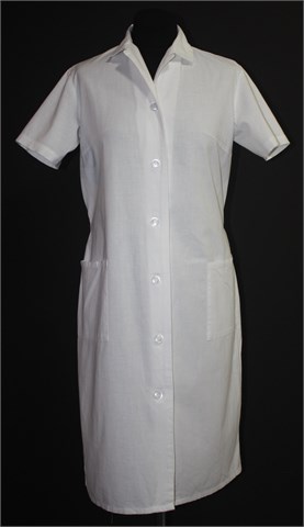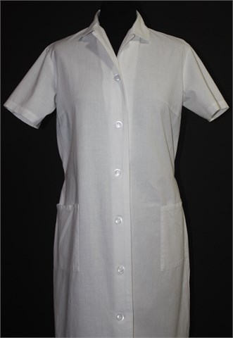 Haljina/kuta sa kratkim rukavima, bijele boje. Kopčanje sa prednje strane, prednji bočni džepovi. U struku trakica-remenčić (fiksno zašiveno sa obje strane) koja se može nositi sa prednje ili stražnje strane (na slici je sa stražnje strane pa se ne vidi). Ušitci za grudi.