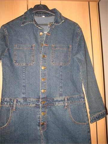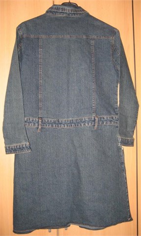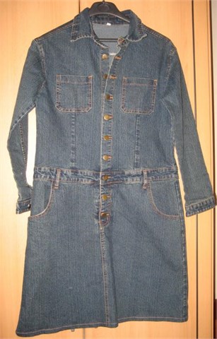 Haljina od trapera sa dugim rukavima. U struku pasica za remen. Prednje kopčanje i džepovi. Otraga bez džepova.