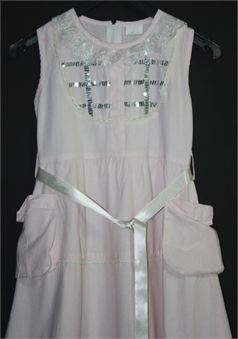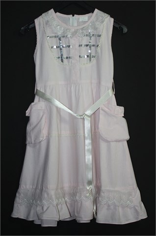 Haljina bez rukava, svijetlo roze boje sa diskretnim točkicama na materijalu. Sa prednje strane ukrašena srebrnim šljokicama, oko ovratnika i na volanima ukrasna čipkica. Stražnji cif, satenska vrpca za vezanje. Bočni džepovi. Lagana i prozračna.