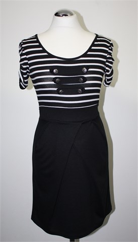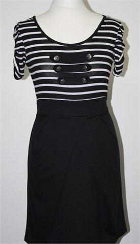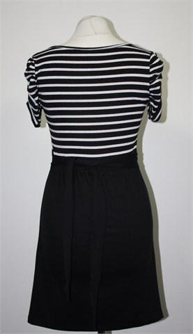 Haljina sa kratkim rukavima (rukavići su nabrani sa gumicom), gornji dio prugasta kombinacija crno-bijele boje sa našivenim aplikacijama (trakice i ukrasni gumbi), materijal je tanji i rastezljiv. Donji dio crne boje, djeluje kao fiksni preklop i materijal je nešto deblji. Bočne trake za vezanje, sa stražnje strane u struku prošivena sa gumicama (prilagodljiva širina - vidjeti mjere). Rastezljiva.