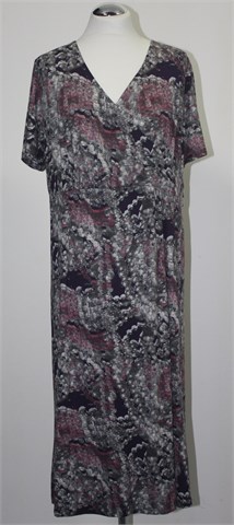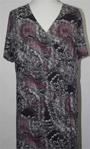 Prekrasna unikatna (šivana) haljina sa kratkim rukavima, prošarani uzorak (boje i uzorci kao na slici). Sa prednje strane fiksni preklop, rezana ispod prsiju. Predivan, mekan i tanji materijal koji se lijepo prilagodi tijelu.