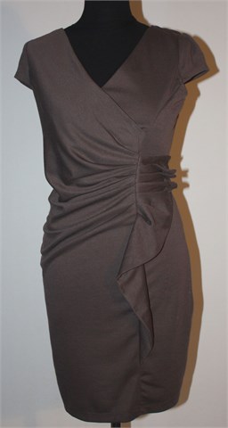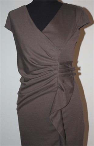 Haljina smeđe boje, sa kratkim rukavima. Sa prednje bočne strane su ukrasni prošivi, dupli materijal u gornjem dijelu. Blago rastezljiv materijal.