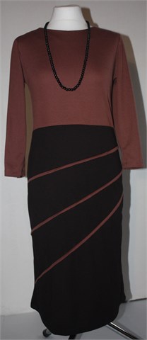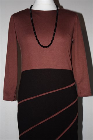 Haljina sa poludugim rukavima. Kombinacija svijetle i tamno smeđe boje. Rastezljiv materijal.