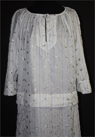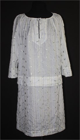 Haljina/tunika sa poludugim rukavima, bijele boje sa končanim cvjetnim aplikacijama i prugama (neke su šljokave pa je blago sjajna). Veći bočni prorezi i mali prorezi na krajevima rukava. Vizualno rezana u struku, nije uz tijelo. Materijal je kao za košulje: vrlo lagan, tanak i prozračan.