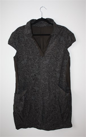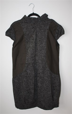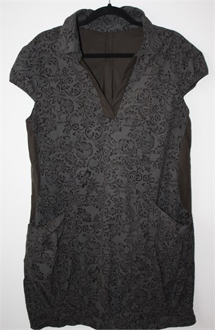 Unikatna (šivana) haljina/tunika sa kratkim rukavima, sive boje sa smeđe-maslinastim detaljima/uzorkom. Dva bočna duboka džepa, prošivi sa stražnje strane. Pufasti kroj (donji dio nije uz tijelo). Materijal je tanji i rastezljiv, izgleda kao tanak samt (prugast materijal).