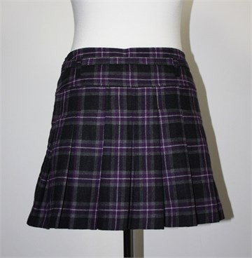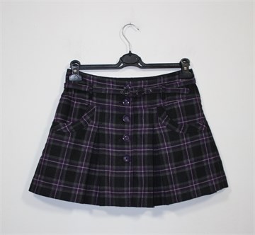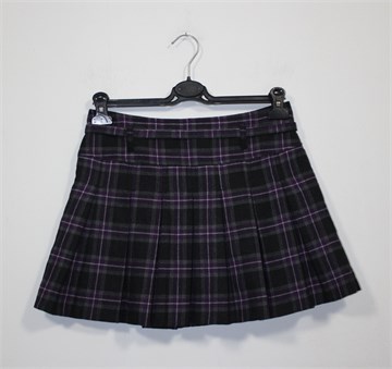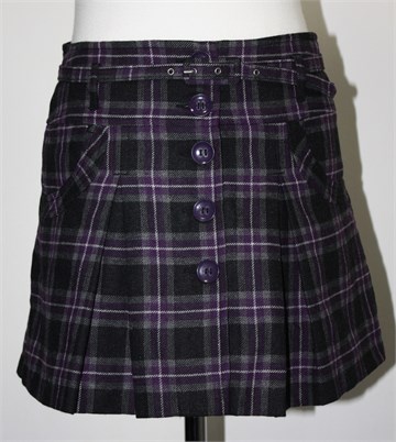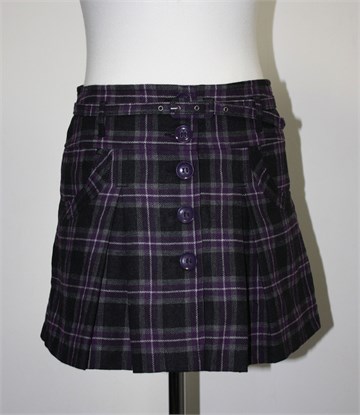 Hallhuber kraća suknja od tanjeg i mekanog štofastog materijala, kombinacija ljubičaste i sive boje (uzorak vidljiv na slikama). Prednje kopčanje, pasica za remen sa pripadajućim tankim remenčićem (može se izvaditi). Bočni džepovi, falde sa prednje i stražnje strane. Podstavljena.