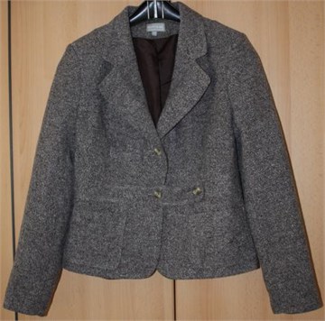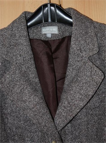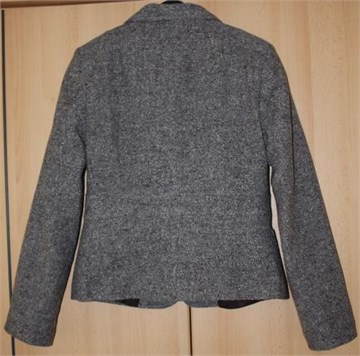Strukiran. Imitacija remena. Podstavljena. Topli i prilično debeli tvid. Odgovara i veličini 38. Nije rastezljiv. Prednji džepovi. Boja je više smeđa nego siva.