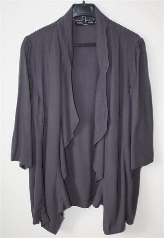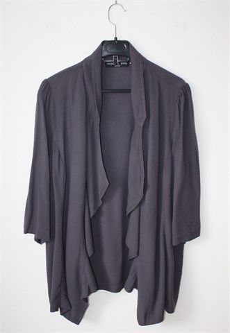 Heart & Soul blazer sa poludugim rukavima, sivo-ljubičaste boje. Bez prednjeg kopčanja (ukrasni volani sa svake strane). Tanji i lagan, nije rastezljiv.
