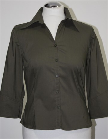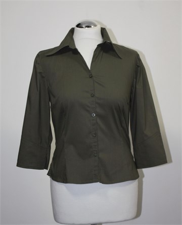 Hennes (H&M) košulja sa poludugim rukavima, maslinasto zelene boje. Prednje kopčanje, strukirana. Rasporci na krajevima rukava i mali bočni rasporci. Rastezljiva.