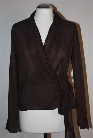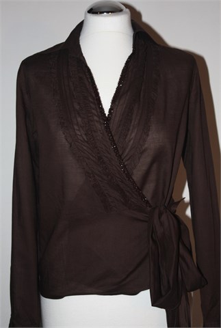 Henry Cottons košulja tamno smeđe boje sa prednjim preklopom i vezanjem. Prednji dio ukrašen volančićima i našivenim perlicama. Vrlo mekan i prozračan pamuk.