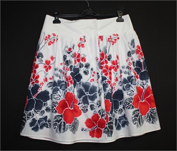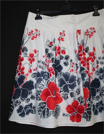 Herry suknja na preklop, bijele boje sa cvjetnim printom. Prednji preklop, kopčanje sa gumbima sa unutarnje strane pasice. Lagan ali čvrst pamuk.