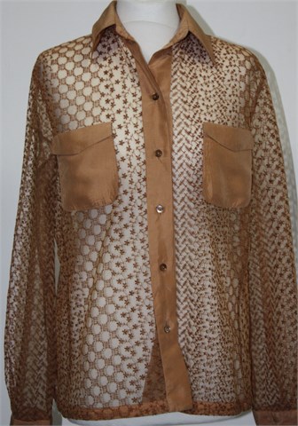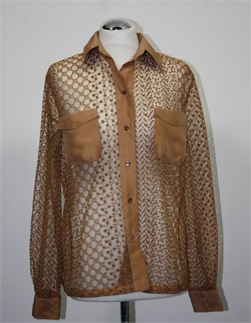 Hilde Kral košulja smeđe-bež boje. Cijela od čipkastog materijala (providna), džepovi i obrubi su od svilenkastog materijala.