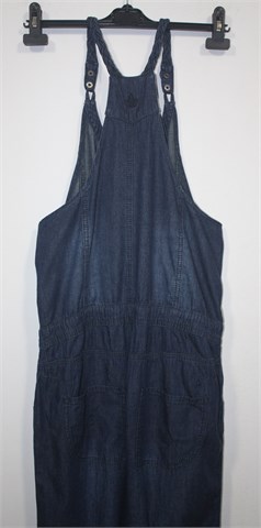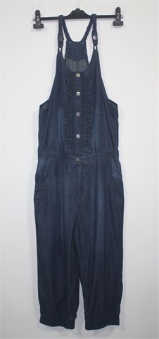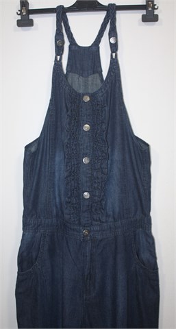 Hillevi kombinezon od tanjeg i mekanog trapera, srednje plave boje. Prednje kopčanje sa drukerima, ukrasni volančići oko kopčanja. Pletene naramenice i kopčanje sa drukerima (u dvije razine). U struku je sa unutarnje strane uvedena gumica sa gumbićima pa se širina može regulirati. Prednji i stražnji džepovi, stegnute gumicom na kraju nogavica. Širi i komotniji model :)