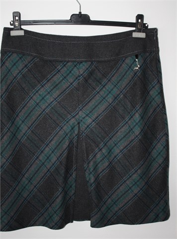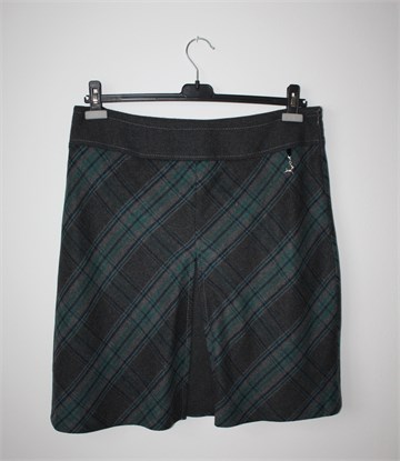 Himmelblau by Lola Paltinger suknja sive boje sa prugasto-kariranim uzorkom (boje koje prevladavaju su zelena i plava - vidljivo na slikama). Bočni cif, prednji ušitak/falda. Sa prednje strane pričvršćen je mali privjesak srebrne boje u obliku jelena (može se skinuti). Topli štofasti materijal, podstavljena.