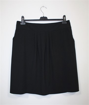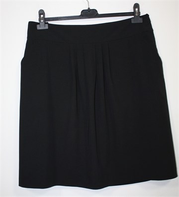 Hirsch suknja crne boje, sa prednje strane faldice. Prednji bočni džepovi (podstava džepova se odšila), bočni cif. Podstavljena (podstava je mjestimično oštećena ali ne smeta kod nošenja). Blago rastezljiva.