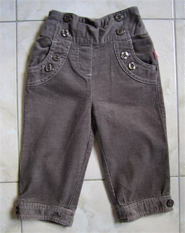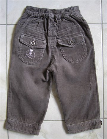Hlačice od samta, svijetlo smeđe boje. Prednji i stražnji džepovi, na stražnjem džepu aplikacija od rozog konca. U stražnji dio pasice ušivena je gumica pa je širina struka prilagodljiva. Tanji i mekani samt.