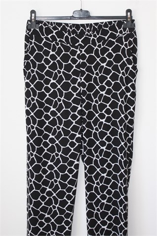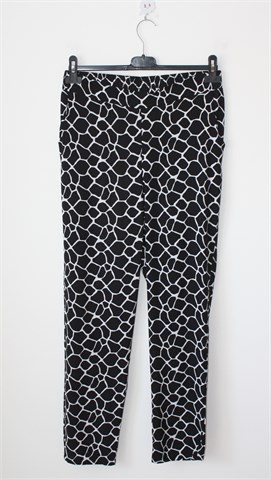 Hlače od viskoze, crne boje sa bijelim printom (uzorak printa vidljiv na slikama). Prednji bočni džepovi, sa stražnje strane pasica je prošivena sa gumicama (prilagodljiva širina - vidjeti mjere). Dublji kroj (visok struk), tanak i prozračan materijal (moguće blago providne).
