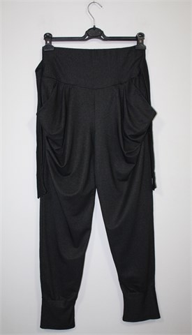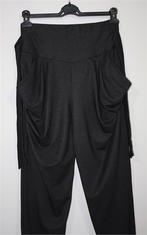 Casual hlače/donji dio trenirke prošarano sive boje. Gumica u struku (dublji, baggy model), duboki džepovi sa naborima sa prednje strane. Blago stegnute na dnu nogavica. Rastezljive, bočne trake za (ukrasno) vezanje.